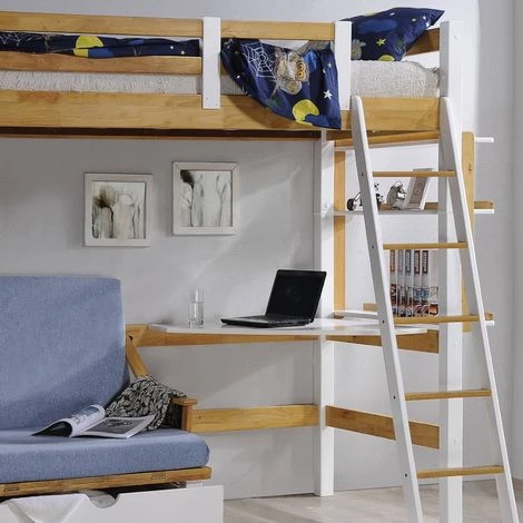 La structure du lit est en bois massif et MDF, le sommier à lattes, bureau, étagères, fauteuil convertible et tiroir de rangement inclus. Matelas et literie non inclus.