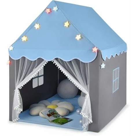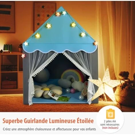 - 【Guirlande électrique avec étoiles & système d’aération :】 Livré avec une guirlande lumineuse avec étoiles scintillantes qui comporte 10 étoiles de couleurs différentes et mesure 2 m, la tente de jeu créera une atmosphère chaleureuse pour la chambre des enfants. De plus, il existe un tapis en coton doux et 2 fenêtres en filet pour une assise confortable et une bonne aération.