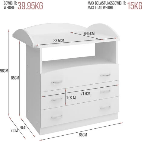 Le design élégant et beaucoup d’espace sont les principales caractéristiques de ce meuble pour bébé. Avec beaucoup d’espace de rangement dans trois tiroirs et un compartiment ouvert, notre commode à langer est le complément idéal de la chambre d’enfant. Changer des couches-culottes sur un grand plan à langer et avoir des vêtements et des produits de soins pour bébés à portée de main, vous et votre bébé mettra à l’aise. La couleur blanche s’intègre facilement dans de nombreux styles d’intérieur. Ce meuble peut être utilisé comme une commode régulier lorsque le bébé grandit.