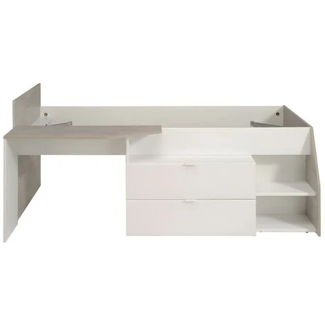 En un seul lit, profitez de toutes sortes de rangements : un bureau, un espace bibliothèque, 2 tiroirs façon commode, un espace de rangement sous le lit.