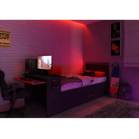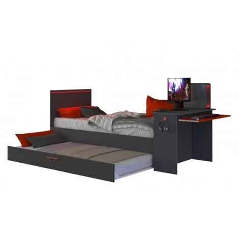 Lit Gamer pour enfant Noir graphite et Rouge avec bureau