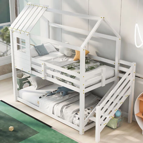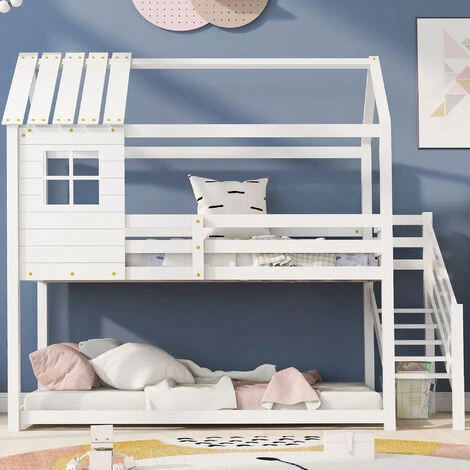 Lit superposé, lit avec escalier d’angle, lit cabane, lit d’enfant avec protection contre les chutes et garde-corps, avec fenêtre, cadre en pin, blanc (200x90cm)