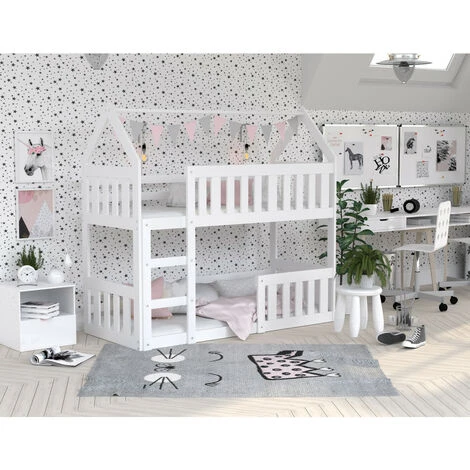 Lit Superposé CABANE MINI 90 X 190 avec sa structure et ses sommiers. Quel enfant n’a jamais rêvé de dormir dans sa cabane ? Ce lit cabane superposé transforme le souhait des enfants en réalité. Grace à son design sobre et moderne, ce lit s’intégrera parfaitement dans la chambre de vos enfant en leur offrant un univers magique.