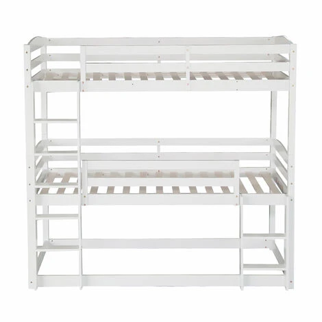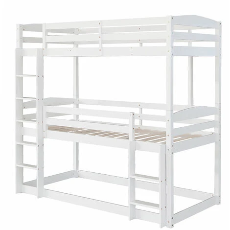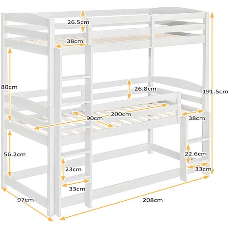 - La couchette du milieu et la couchette supérieure sont équipées de barrières pour assurer une protection efficace contre les chutes. Livré avec deux échelles intégrées pour monter et descendre. Ce lit superposé vous offre une sécurité de premier ordre.