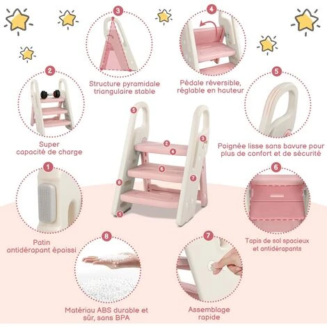 【Grandit avec votre enfant】Il suffit de tourner doucement le panneau supérieur pour que notre tabouret 3 marches se transforme en tabouret 2 marches ou en chaise pour enfant ! Réglez la plate-forme à 26 cm ou 40 cm pour que votre marche-pied soit à la hauteur parfaite pour votre enfant en pleine croissance.