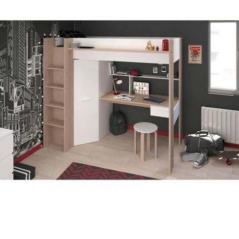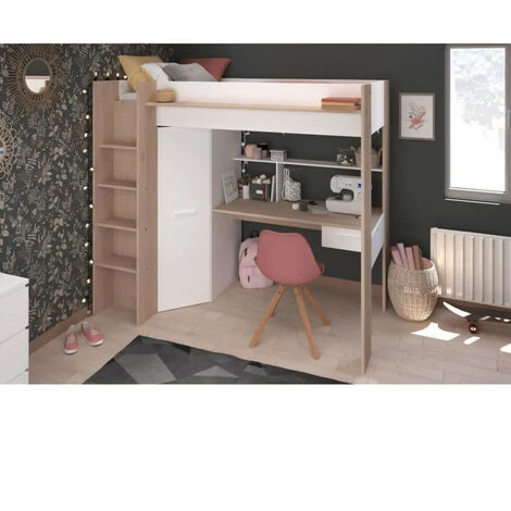 PARISOT HIGH Lit Combiné Mezzanine Enfant – Décor Chene Et Blanc – Sommier Inclus – 90 X 200 Cm