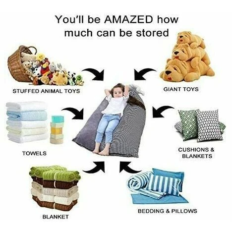 【Très grande taille】 Ce sac de rangement mesure 35 * 50 * 30 pouces (90 * 127 * 76 cm) et peut contenir 200 L / 52 gallons de farce, environ 100 petits animaux en peluche. Cela vous aidera, vous et votre enfant, à organiser chaque poupée et jouet, couverture, oreiller, serviette et même les vêtements hors saison, ce qui réduira également l’utilisation de l’espace de rangement.