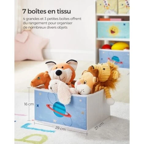 - 7 boîtes en tissu amovibles : 4 grands paniers et 3 petits paniers pour ranger les jouets et les livres de vos enfants.