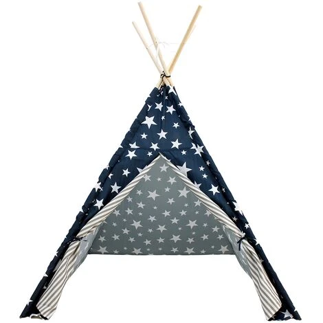 Le joli design en bois naturel et tissu bleu avec des étoiles blanches et des portes de tente rayées gris-blanc attire l’attention dans toutes les pièces – qu’il s’agisse de la salle de séjour ou de la chambre des enfants. Avec son atmosphère chaleureuse et sa petite fenêtre, le tipi est l’endroit idéal pour jouer, se cacher et rêver. Grâce à son sac de transport pratique de même conception et à son montage très facile, la tente est une protection solaire parfaite dans le jardin ou sur la plage, même pendant les chaudes journées d’été.