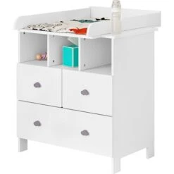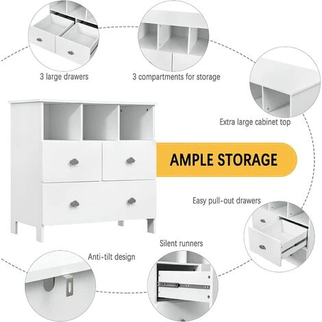 - [Espace de rangement accru] La commode blanche a 3 tiroirs et 3 compartiments ouverts. Ses tiroirs protègent les articles de la poussière. Ses compartiments permettent de garder des articles à portée de main. comme les couches. les lingettes humides.etc.